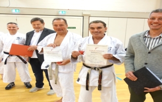 Bild sind von links: Michael Ahl, Tobias Kern (Trainer im Karateverein), der Präsident des hessichen Fachverbandes für Karate Herr Reinhard Schmidt-Echardt, Markus Emmerich 7. Dan, Richard Grasse 6. Dan und Dieburgs Bürgermeister Fank Haus.